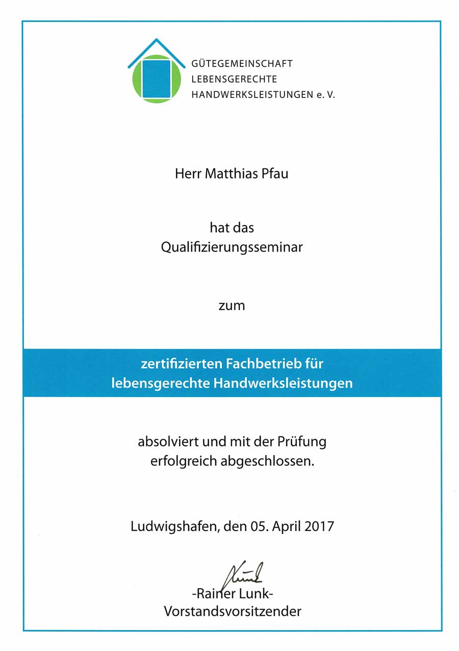 Matthias Pfau gründete 2004 seinen Meisterbetrieb für barrierearme und lebenswerte Räume in Römerberg. Als Schreinermeister hatte er zuvor hochwertige Inneneinrichtungen, Designküchen und Gaststätteneinrichtungen gebaut.