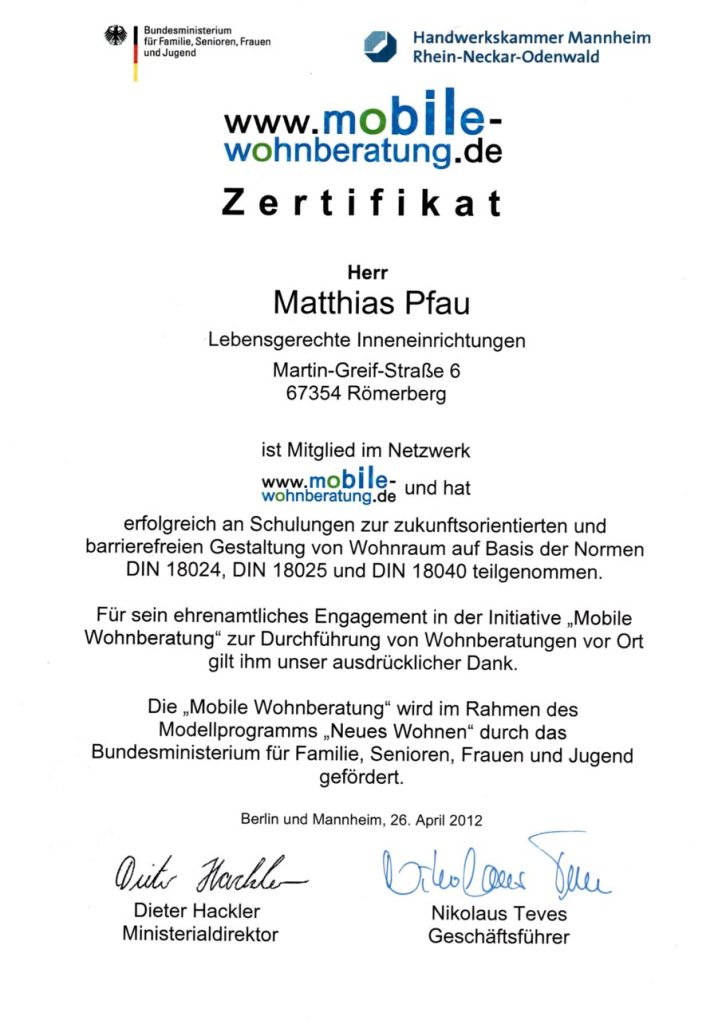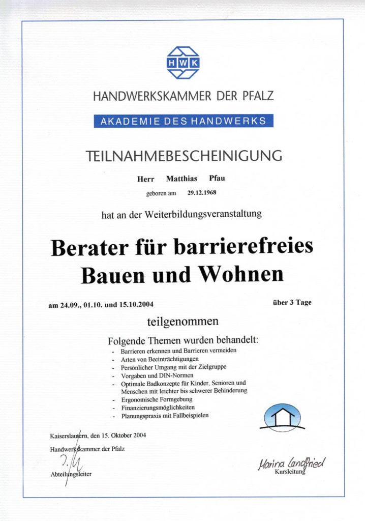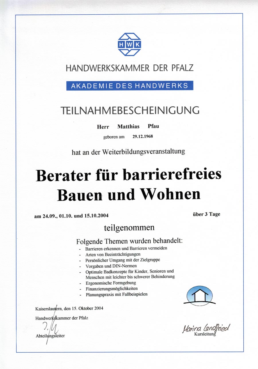 - 2004 Weiterbildung zum Berater für barrierefreies Bauen und Wohnen